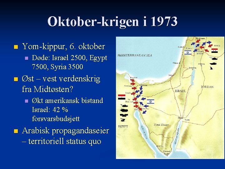 6 oktober 1973 da de arabiske stater ledet af Egypten og Syrien iværksatte et overraskelsesangreb mod Israel under Yom Kippur Yom Kippur er en fastedag og den helligste dag i den jødiske kalender. Men i Israel ble krigen opplevd som meget traumatisk rett og slett fordi den viste at selve Israels overlevelse var truet. August 1970 der afsluttede Umattelseskrigen blev brudt allerede samme dag da egypterne rykkede avancerede sovjetiske våbensystemer frem til Suez-kanalen.